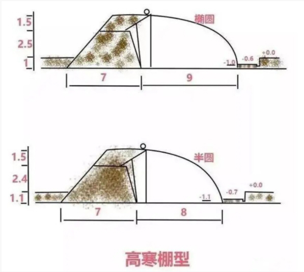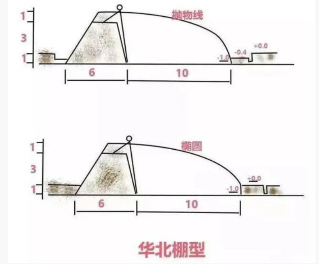 特點:后墻到頂并加厚,保溫蓄能;太陽入射角較低,棚面弧度加大;遇到冬雪、春雨氣候,適合覆蓋草簾和覆膜,地下水位深,畦內種植。
