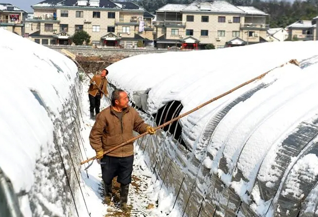 3、雪災寒潮預警發布時,白天黑夜要有人查看,及時清除棚頂積雪。下雪時應及時上好草簾子或保溫被,草簾子或保溫被上面用防寒膜覆蓋,把大棚門關緊關嚴加裝薄膜堵住進風口,以防冷風進入。
